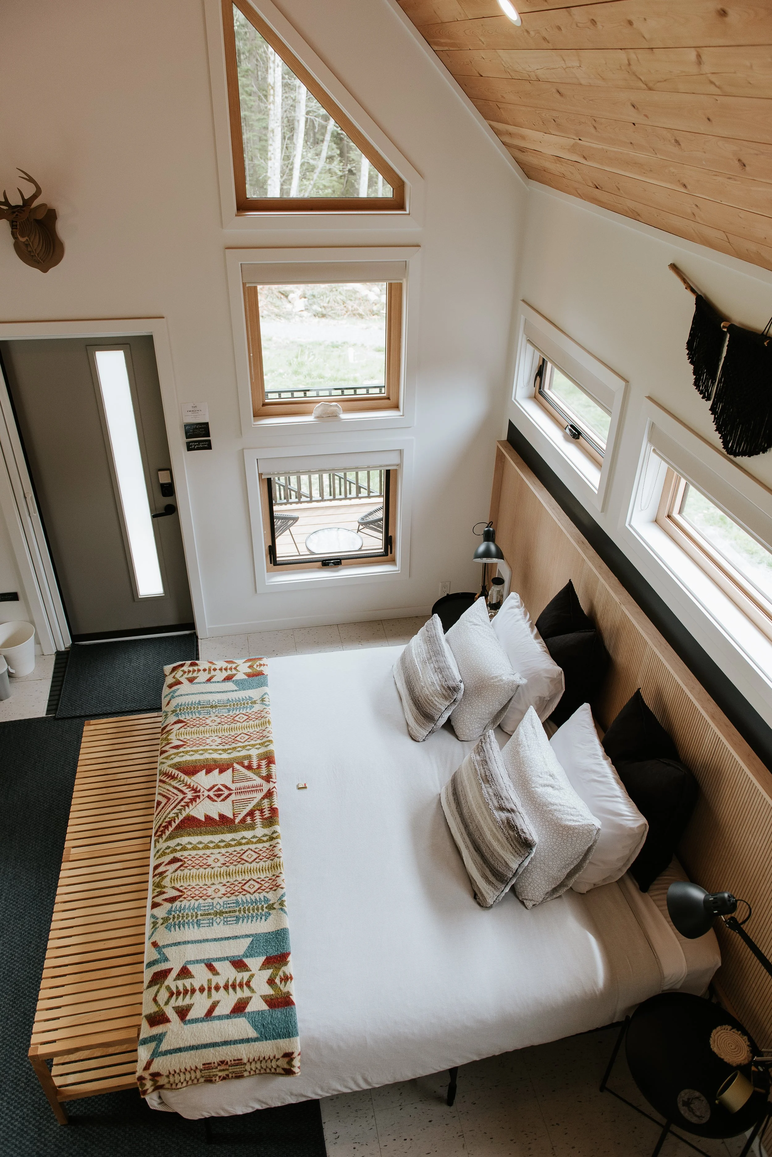 Whitewashed walls and a warm, pine-clad angled ceiling await you in this cozy bedroom. With skylights in both the bedroom and attached ensuite bathroom, as well as a large window overlooking our A-Frame Cottages, nature is at your fingertips from this simple room. *Located upstairs in the Onyx Lodge, our main gathering space, this room can have some noise from below.