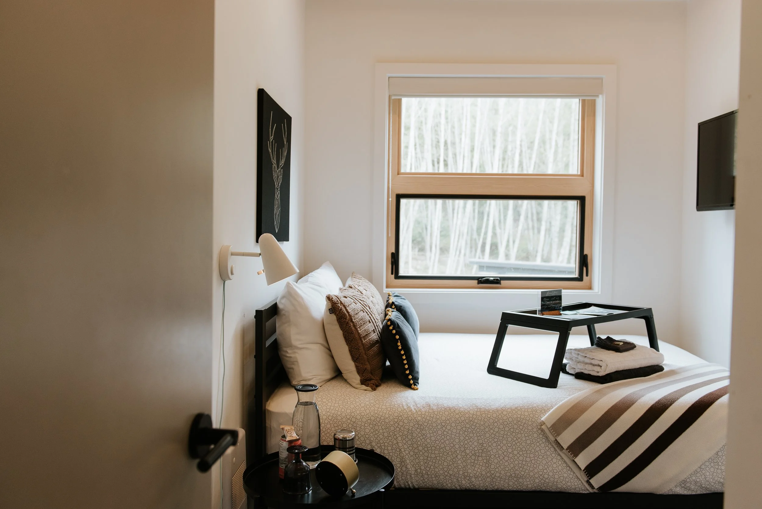 Large windows capturing the forested views of the property await you. With a spacious closet for storage, soft linens and warmly-lit bedside lamps, these small, simple rooms are perfect for our solo travelers. The shared full bathroom next door includes two sinks and a walk-in shower. *Located upstairs in the Onyx Lodge, our main gathering space, this room can have some noise from below.